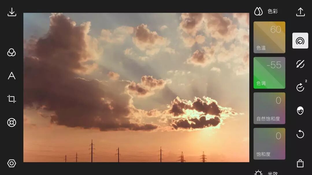 可以看到,这时候画面中的洋红色就得到了明显的抑制。同理,如果画面偏向于绿色,我们可以通过提高色调值为画面加入洋红色来实现色彩平衡。接下来我们的操作就和前面一样了,提高色温值为画面加入暖色调: