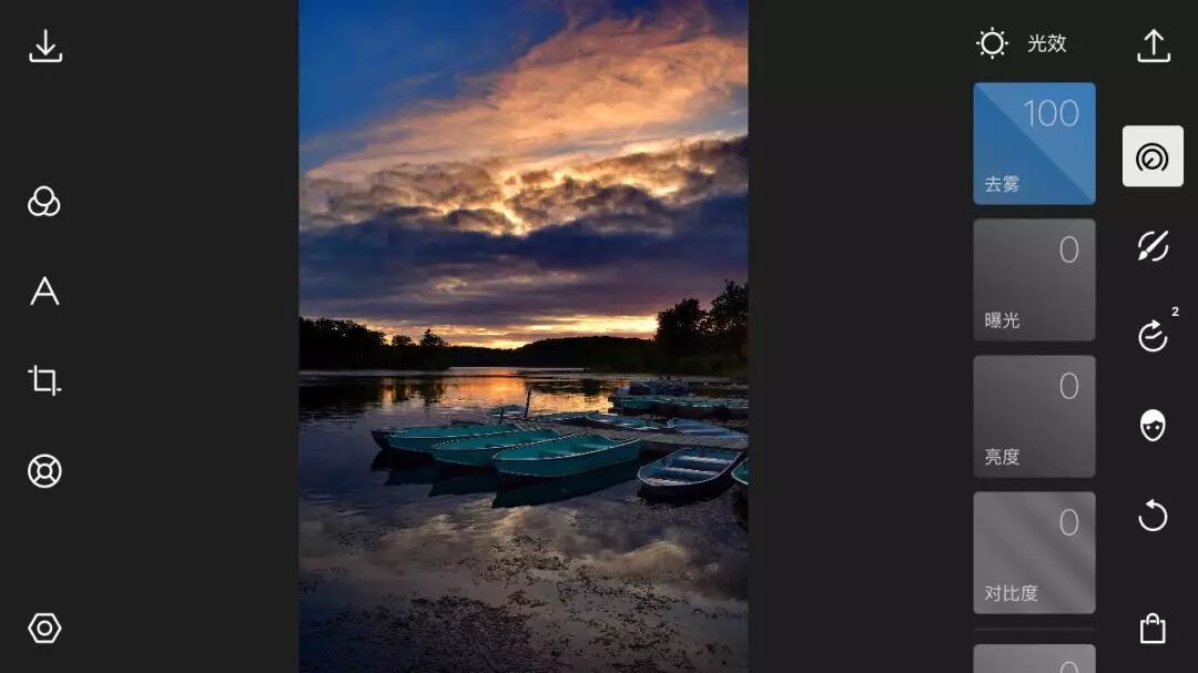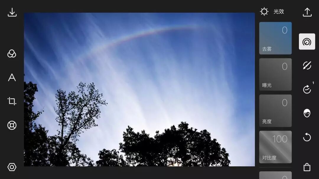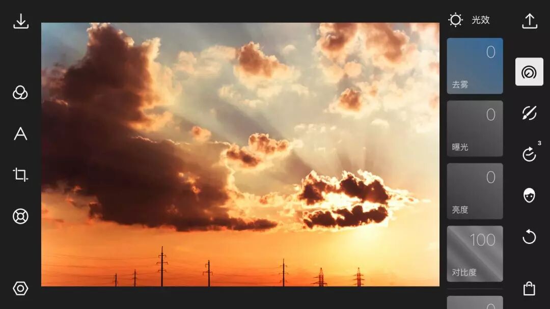 首先我们进入全局调整的光效菜单,将去雾值提高到最大,这一步的操作可以让天空的形态更加明显: